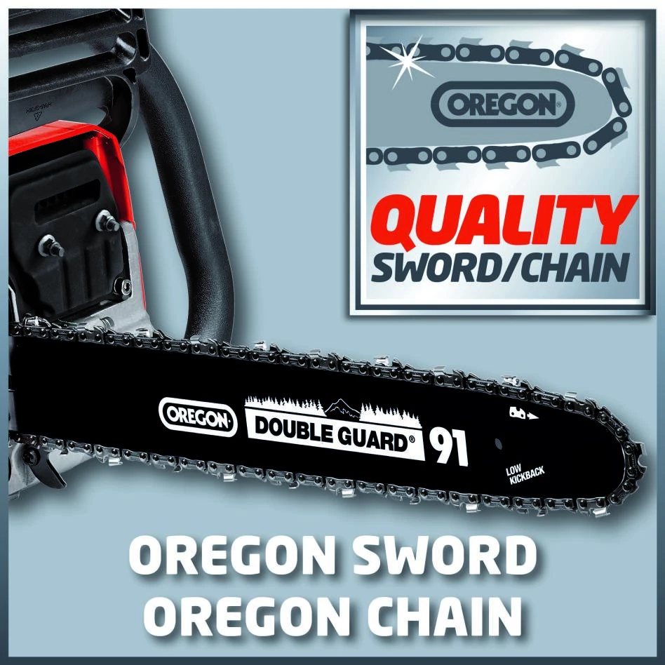 La Einhell GC-PC 2040 I est une puissante tronçonneuse à essence, qui peut être utilisée pour la taille des arbres, des haies et des talus dans les jardins ou les parcs. Grâce à un réservoir d’essence relativement grand (540 ml), cette tronçonneuse à essence dispose d’une longue autonomie, ce qui vous permet d’effectuer plusieurs travaux d’élagage à la fois. Cette tronçonneuse à essence est équipée d’un puissant moteur à essence de 2000 W, à deux temps, refroidi par air, d’une cylindrée de 50,4 cm3. Cela confère à la machine une vitesse maximale de 11 500 tr/min et une vitesse de coupe de 22 mètres par seconde. Cela suffit pour couper sans effort les branches des arbres. La combinaison d’un starter automatique, d’un amorceur et d’un allumage numérique permet à la tronçonneuse à essence de démarrer très rapidement et facilement. Vous pouvez donc utiliser la machine immédiatement et vous n’êtes plus coincé avec un câble de démarrage. Pour la plus longue durée de vie possible de la tronçonneuse à essence est équipé d’une lubrification automatique de la chaîne. L’huile est prélevée dans un réservoir d’huile d’une capacité de 240 ml. Avec la bouteille de mélange fournie (sans contenu), vous pouvez facilement remplir le réservoir d’huile lorsqu’il est vide. Pour vous protéger et protéger la machine, elle est équipée d’une protection contre le rebond avec arrêt de la chaîne. Cela signifie que la machine s’arrête automatiquement si la chaîne menace de se bloquer. A l’avant, il y a également une griffe métallique qui vous empêche de pousser le moteur contre un coffre. Autour de la poignée de cette tronçonneuse à essence se trouve un grand couvercle de protection, qui protège vos mains des projections de branches et d’autres matériaux. Vous pouvez donc travailler en toute sécurité avec cette machine. La poignée de cette machine absorbe une grande partie des vibrations qui sont libérées lors des travaux de sciage. Cela rend la machine robuste et confortable à tenir. Cette tronçonneuse à essence est livrée avec une épée et une chaîne OREGON de qualité, ce qui signifie que ces deux éléments ont une longue durée de vie et peuvent passer sans effort à travers des branches épaisses. L’épée a une longueur de 400 mm et une longueur de coupe de 390 mm.